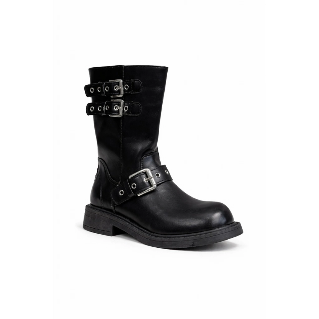 Bota biker negra con triple hebilla metálica y detalle de tachas. Caña media, punta redondeada y suela baja resistente para máximo confort. Ideal para looks urbanos. Talles 36 al 40.