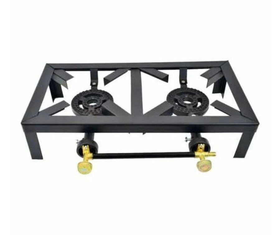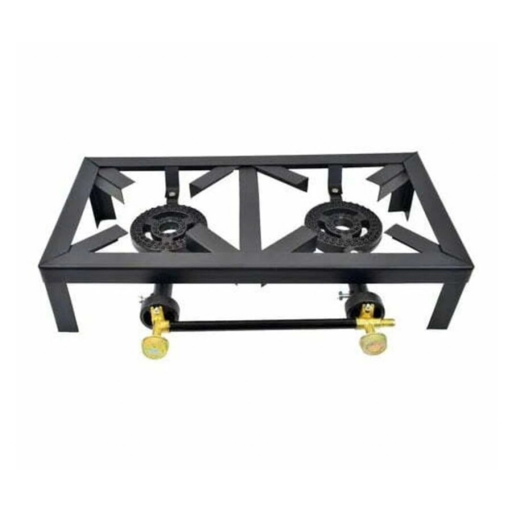 Hornalla doble de hierro con base reforzada y perillas regulables. Ideal para cocina industrial, camping o uso profesional. Durable y estable. Medidas: 6×24.5×10.5 cm.
