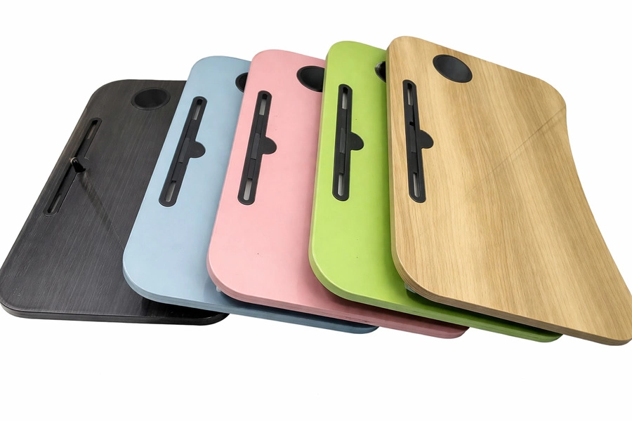 Mesa portátil multifunción Dimensiones: 40 × 60 cm Disponible en varios colores y acabados (madera, pastel, neutros). Incluye ranura para tablet / teléfono y espacio circular para vaso. Superficie lisa y resistente, ideal para trabajar, estudiar o usar laptop. Diseño ligero y fácil de transportar.