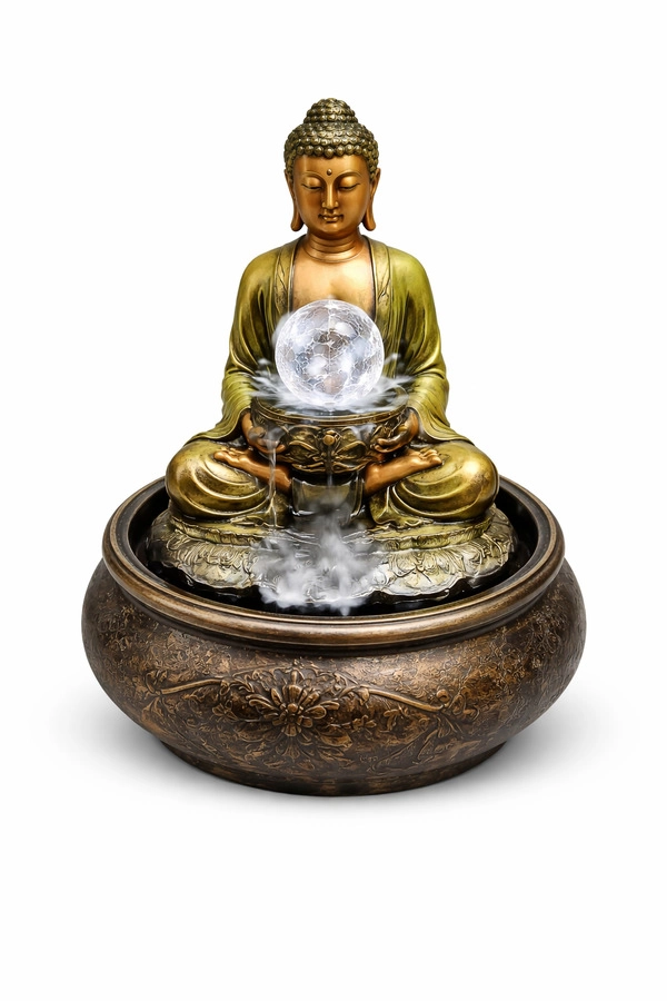 Fuente de agua ornamental ideal para crear un ambiente de calma y armonía. Presenta figura de Buda con esfera de cristal y efecto cascada, perfecta para el hogar u oficina. Diseño elegante, fácil de usar y de bajo consumo. Aporta relajación y estilo a cualquier espacio.