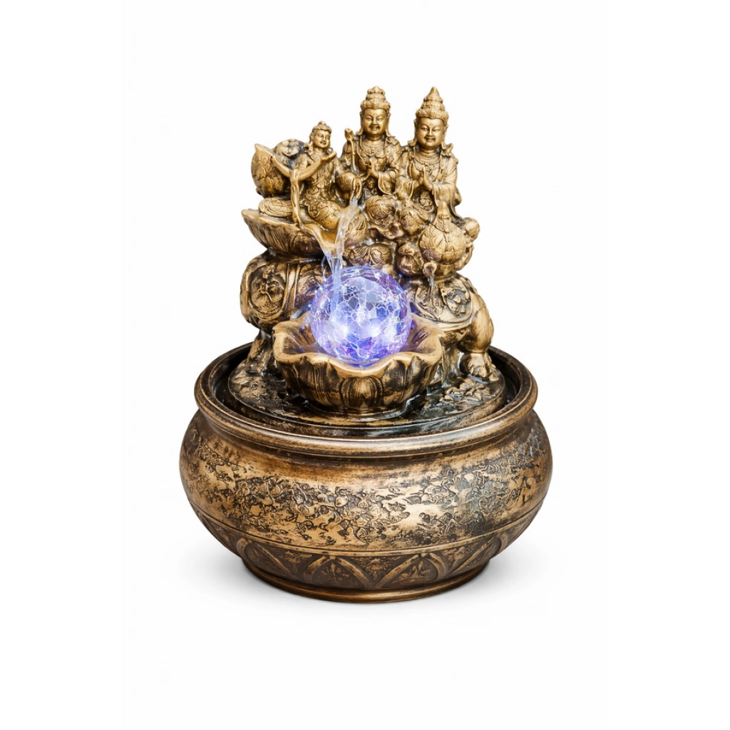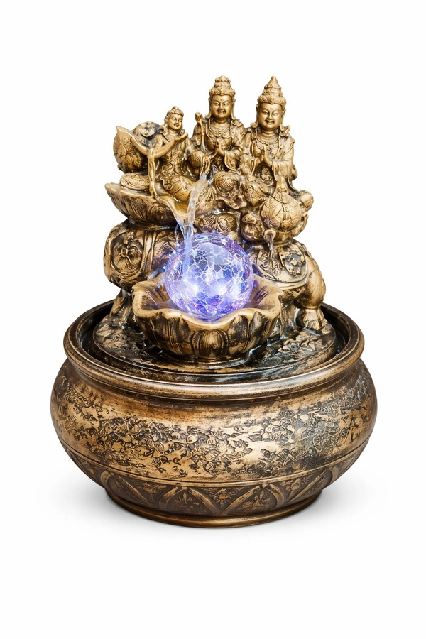 Fuente de agua decorativa de estilo oriental, ideal para crear un ambiente de armonía y relajación. Presenta figuras detalladas en acabado dorado y una esfera central iluminada que realza el efecto visual del agua en movimiento. Perfecta para decorar hogares, oficinas o espacios de meditación, aportando elegancia y energía positiva al entorno.