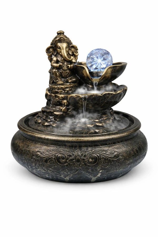 Fuente decorativa de agua con diseño artístico y estilo oriental, ideal para crear un ambiente relajante y armonioso. Incluye detalle ornamental y esfera decorativa que realza el flujo del agua. Perfecta para el hogar, oficina o espacios de meditación. Aporta calma, equilibrio y un toque elegante a cualquier ambiente.