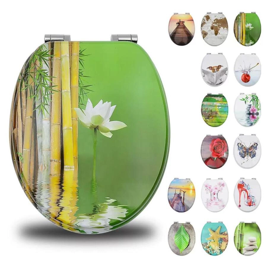 Asiento de WC Decorativo Dimensiones: 36 × 43 × 4 cm Espesor: 4 cm Modelos con diseños impresos en alta calidad (marinos, florales, urbanos, botánicos y geométricos). Compatibles con la mayoría de tazas estándar. Material resistente y de fácil limpieza.