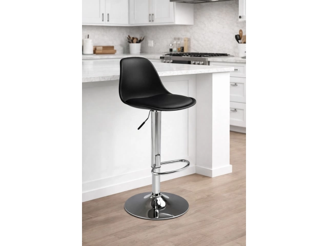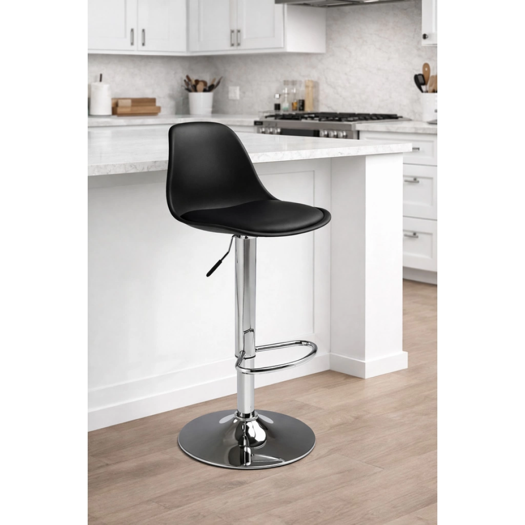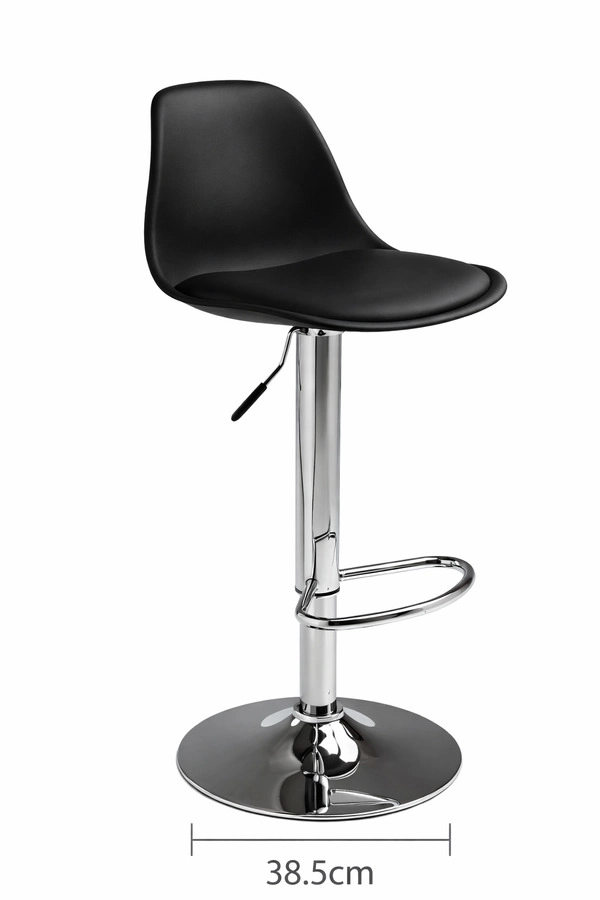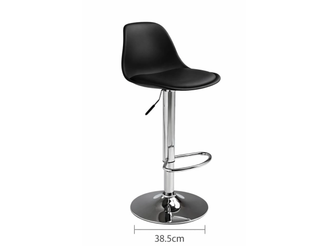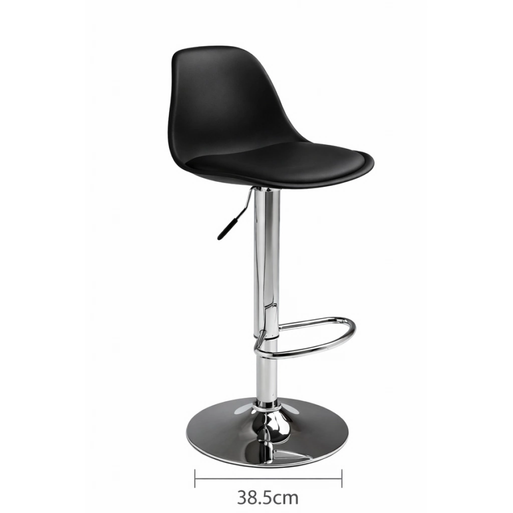 Banqueta alta regulable con asiento ergonómico. Medidas: asiento 37 x 38 cm, respaldo 25 cm de alto, base circular de 38,5 cm. Altura ajustable hasta 90 cm, con apoyapiés cromado Presentación en caja de 5 unidades
