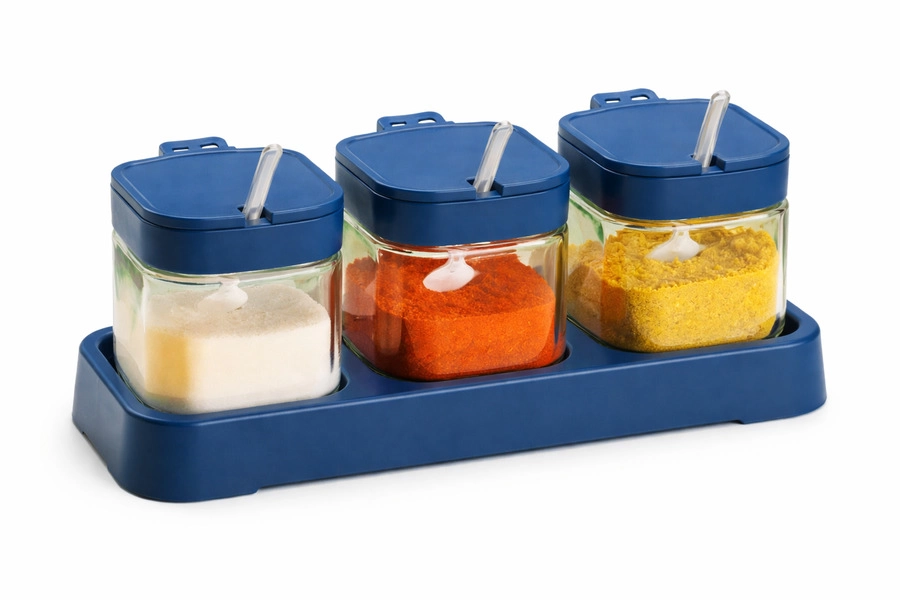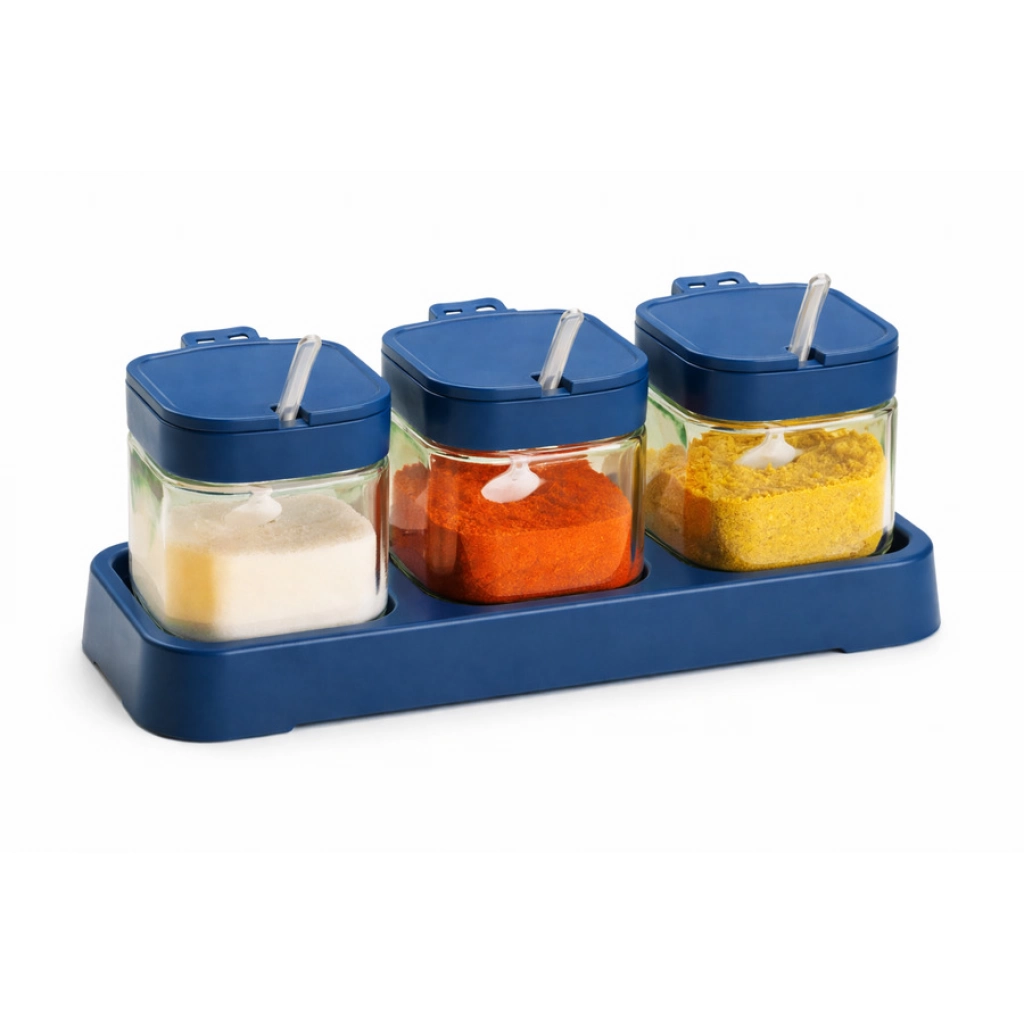 Set de especieros compuesto por 3 frascos de vidrio transparente, ideales para almacenar y organizar condimentos, azúcar, sal o especias. Cada frasco cuenta con tapa con dosificador y cuchara integrada para un uso práctico y limpio. Incluye base organizadora que mantiene todo ordenado y al alcance. Diseño moderno y funcional, perfecto para la cocina y para mantener los ingredientes siempre visibles y frescos.