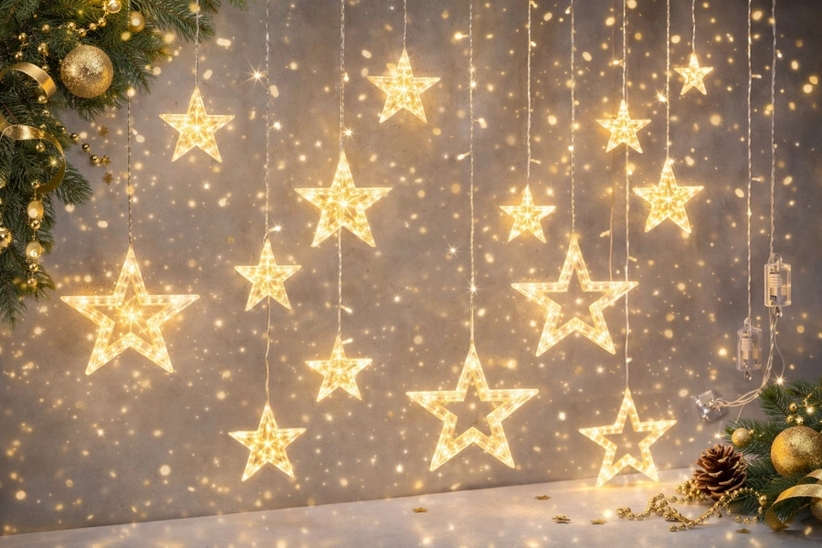 Cortina de luces LED en forma de estrellas, ideal para decorar interiores y exteriores. Diseño con estrellas de distintos tamaños que crea un efecto cálido y elegante. Largo total de 3 metros, perfecta para Navidad y eventos.