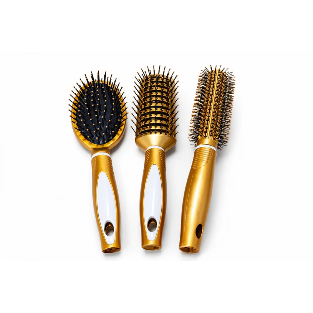 Set de 3 cepillos para el cabello de diseño profesional, ideales para desenredar, alisar y dar volumen. Incluye cepillo plano, cepillo ventilado y cepillo redondo COLORES DISPONIBLES: -VERDE -PLATEADO´ -ROSADO -DORADO LA CAJA CERRADA CONTIENE: 48 UNIDADES