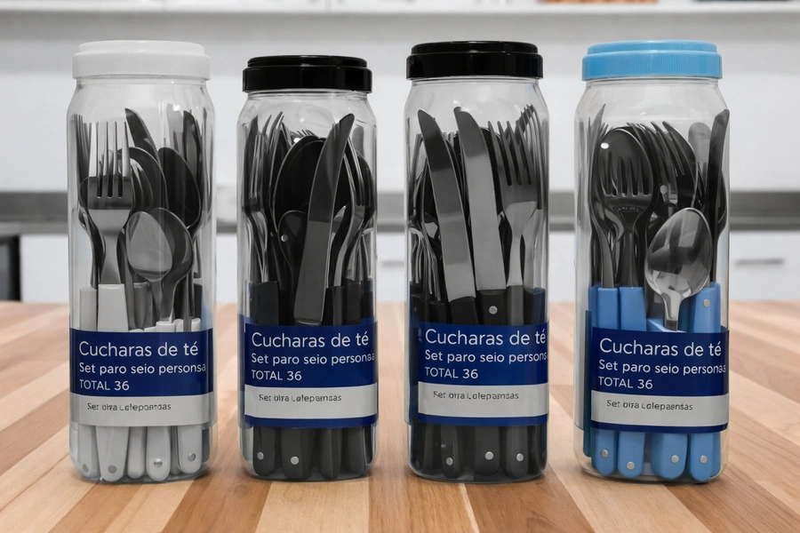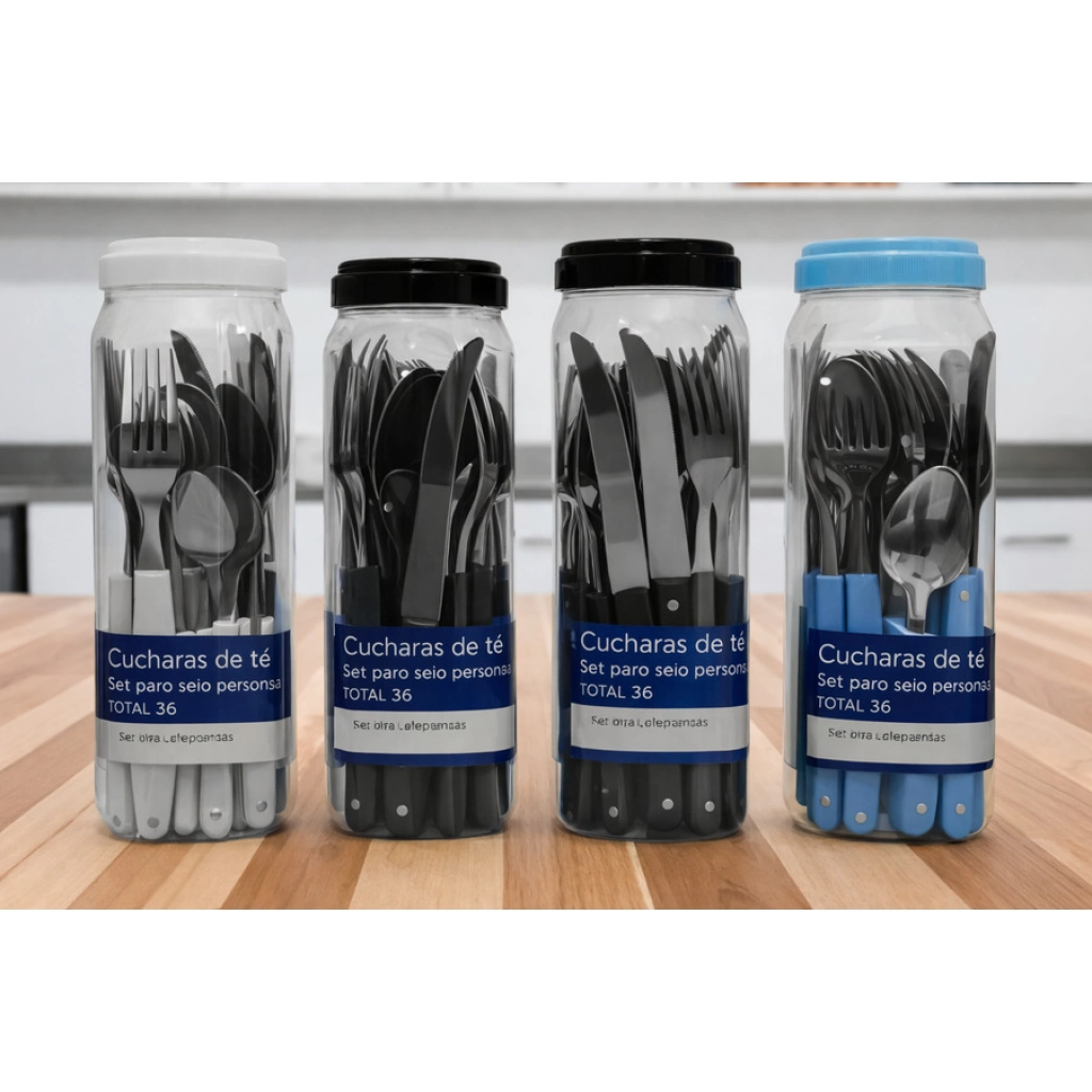 Juego de 25 cubiertos fabricados en acero inoxidable con mangos plásticos ergonómicos. Incluye tenedores, cuchillos y cucharas para uso diario. Resistente, fácil de limpiar y presentado en envase práctico para almacenamiento. LA CAJA CONTIENE: 24 UNIDADES