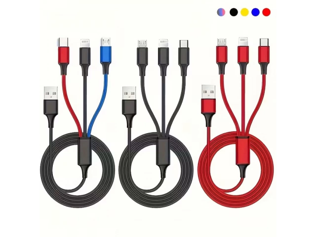 Cable multipuerto de carga rápida 3.1A, diseñado para ofrecer carga eficiente y transferencia de datos estable. Incluye conectores Micro USB, Type-C y Lightning, compatibles con la mayoría de smartphones y dispositivos electrónicos. DISPLAY DE: 12 UNIDADES CAJA CERRADA CONTIENE: 40 CAJAS DE 12 UNIDADES
