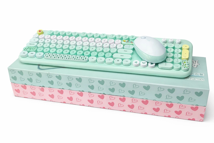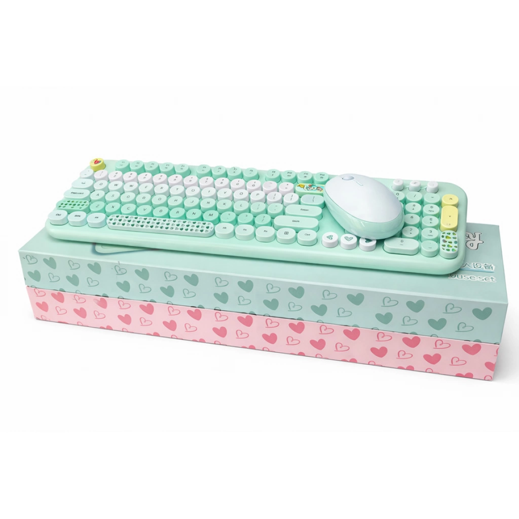 Set de teclado y mouse inalámbricos con diseño retro y colores pastel, ideal para darle un toque moderno y delicado a tu espacio de trabajo o estudio. El teclado cuenta con teclas redondeadas y suaves al tacto, que ofrecen una escritura cómoda y silenciosa, mientras que el mouse ergonómico brinda un manejo preciso y confortable.