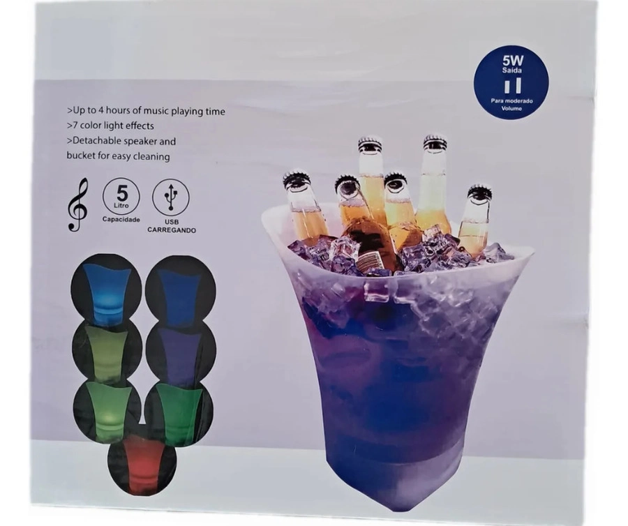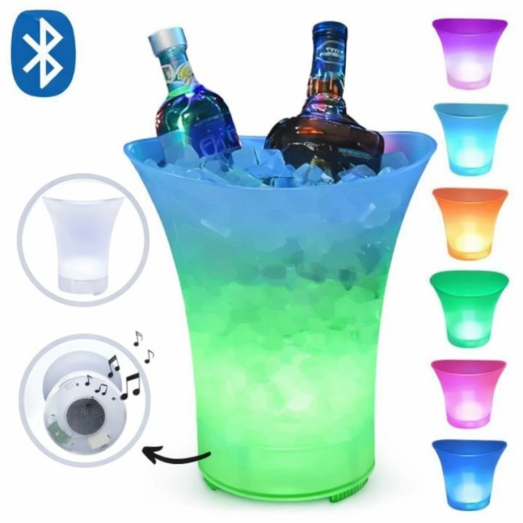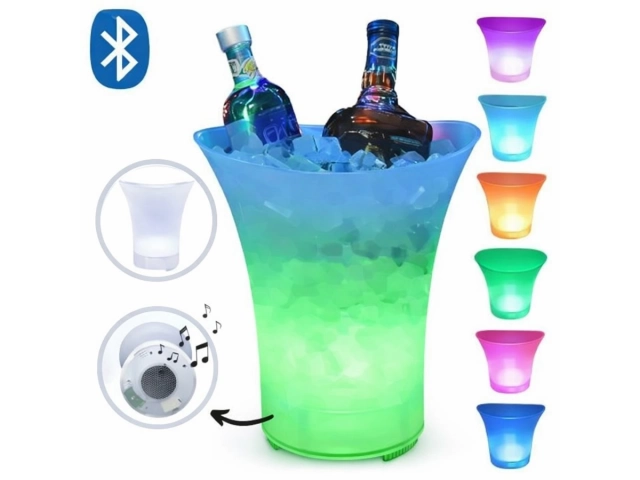 Baldes iluminados LED con capacidad de 5 litros, ideales para mantener bebidas frías con estilo en fiestas, eventos y reuniones. Fabricados en plástico resistente, ofrecen una iluminación multicolor que crea un efecto decorativo moderno. CAJA DE 20 UNIDADES