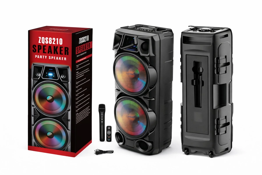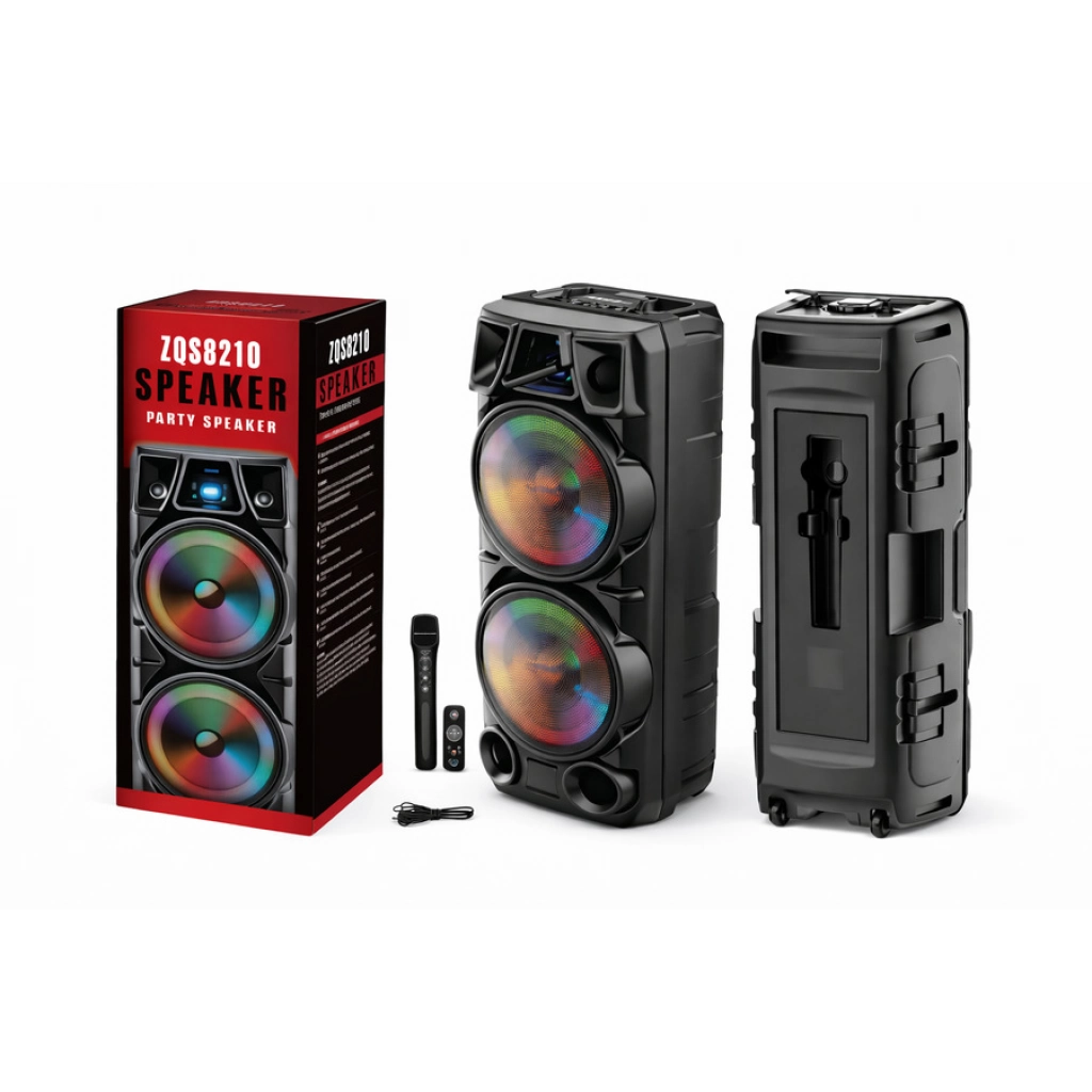PARLANTE? 8 pulgadas Potencia: 9W x 2 Altavoces: 2 de 8 pulgadas 1 altavoz de graves/agudos adicional Batería: 18650 / 3.7V / 3000 mAh Funciones: Bluetooth USB Tarjeta TF AUX Radio FM TWS Accesorios incluidos: Cable de carga Micrófono inalámbrico Control remoto