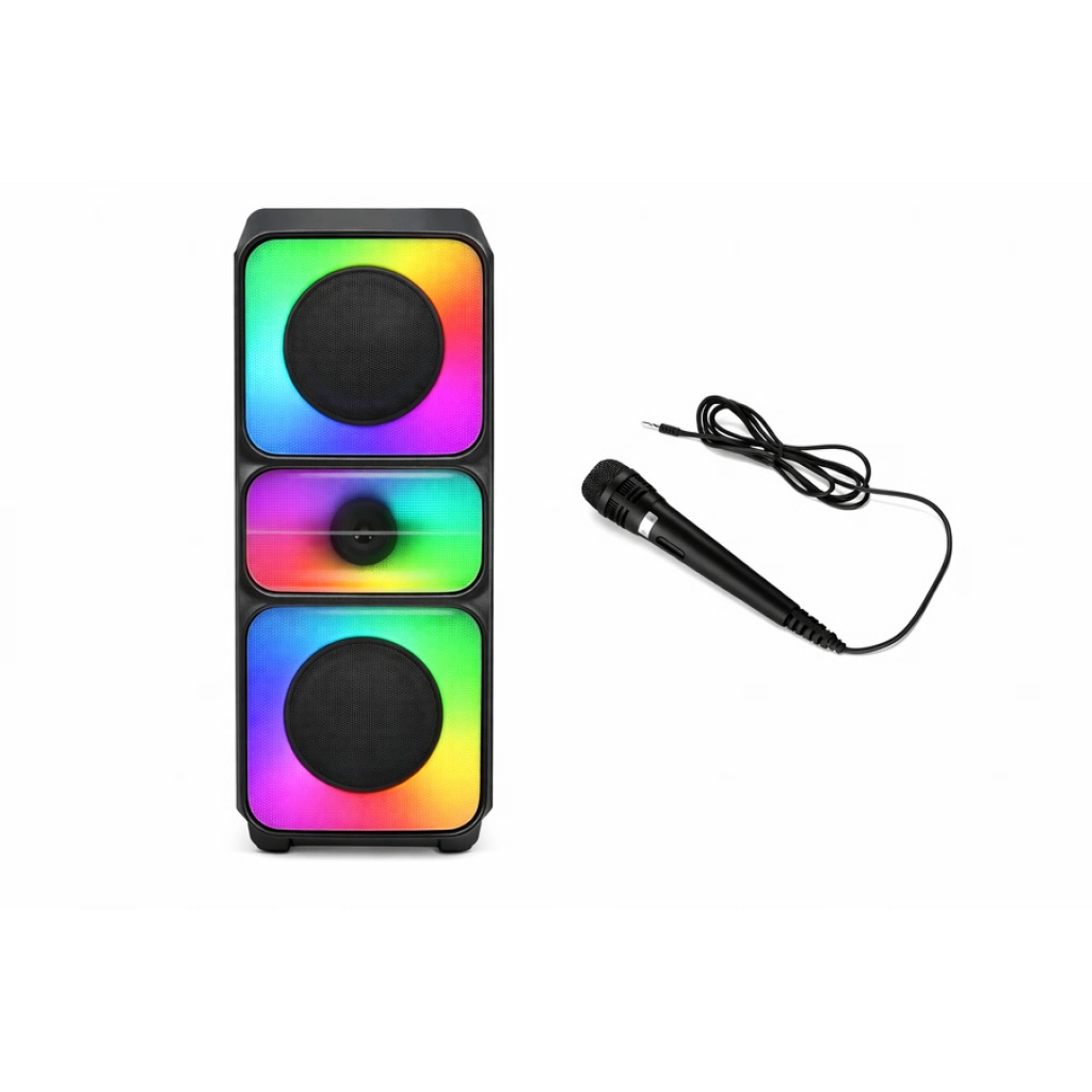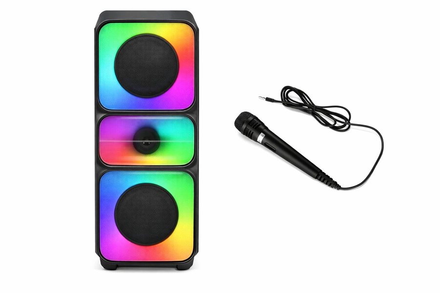 Parlante multimedia portátil equipado con dos drivers dinámicos de 3", configurados en disposición vertical para optimizar la dispersión acústica. Ofrece respuesta de frecuencia amplia y presión sonora adecuada para ambientes reducidos. Integra módulo de conectividad multifunción (Bluetooth*, USB, entrada AUX y lector de tarjeta TF*, según disponibilidad del modelo) y panel de control para gestión de volumen, modo y reproducción. Incorpora sistema de iluminación LED RGB con efectos variables. Incluye micrófono dinámico unidireccional con cable, ideal para karaoke o uso vocal básico. La unidad funciona mediante batería recargable interna, con puerto de carga USB. Construcción en ABS de alta resistencia, rejillas metálicas y diseño ergonómico para mejorar portabilidad y disipación de calor.
