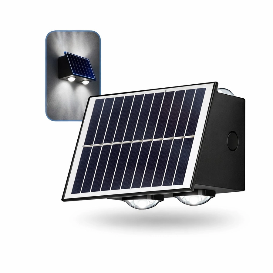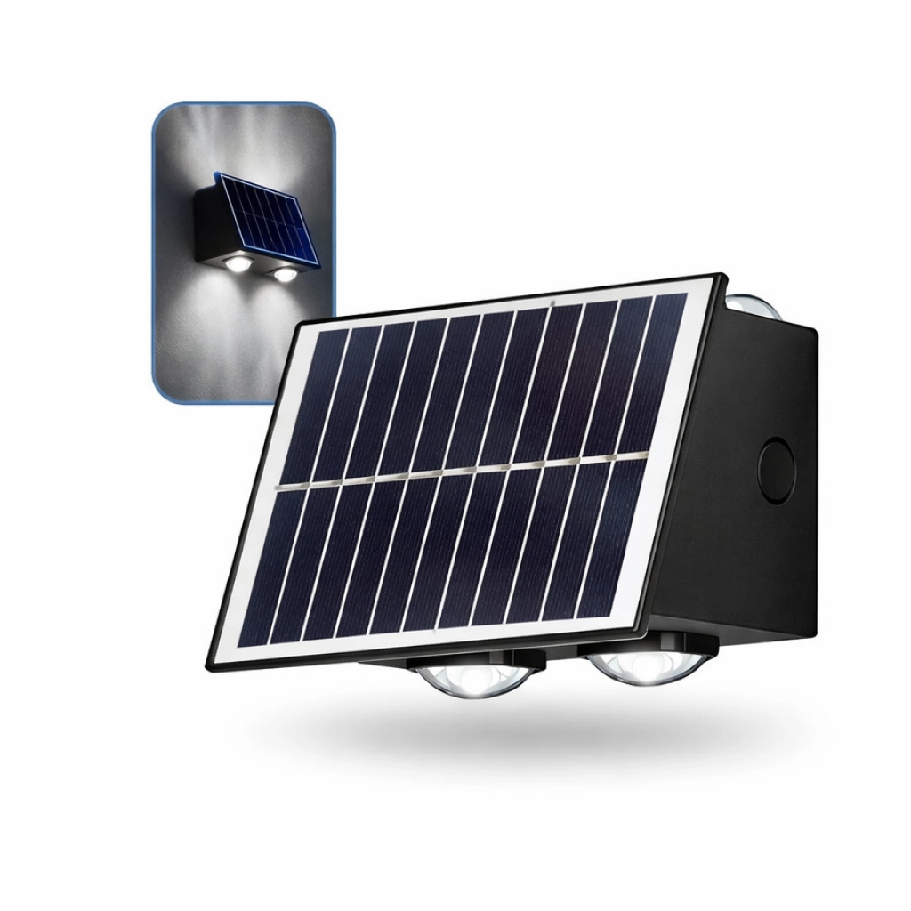 Aplique solar LED para exterior con panel integrado. Iluminación automática y decorativa, ideal para entradas, patios y jardines. Funciona sin cables. Incluye 4 luces