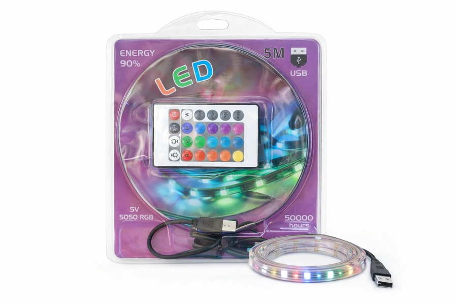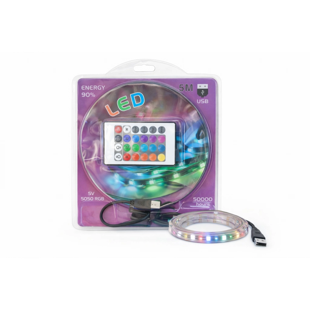 Tira LED RGB USB de 5 metros con bajo consumo energético. Incluye control remoto para cambiar colores, efectos y brillo. Ideal para decorar habitaciones, escritorios o TV. Alimentación USB, fácil instalación y larga vida útil.