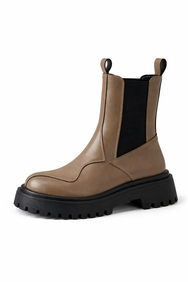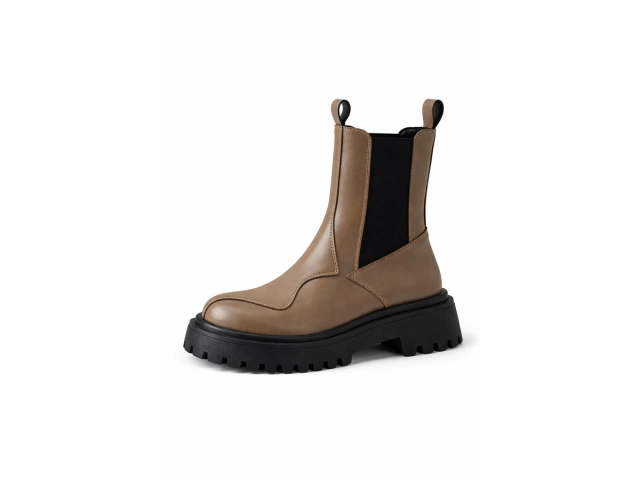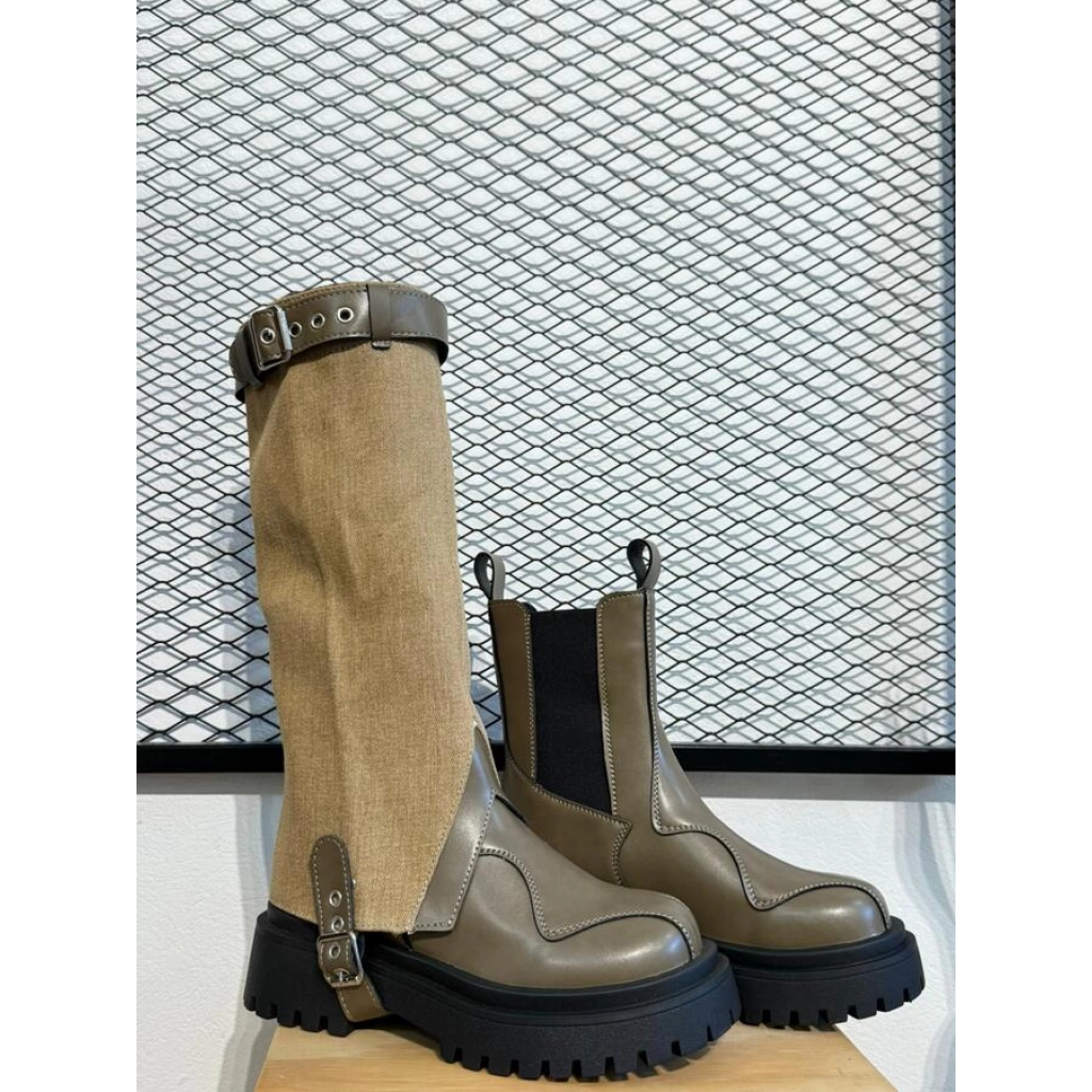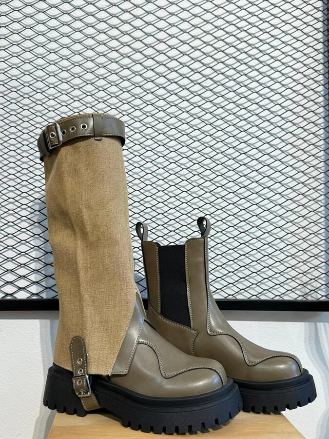 Botas con caña removible tipo polaina, color verde oliva con detalle camel. Suela chunky antideslizante y cierre elástico lateral. Talles 36 al 40.