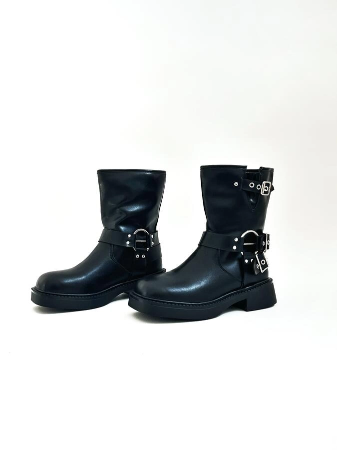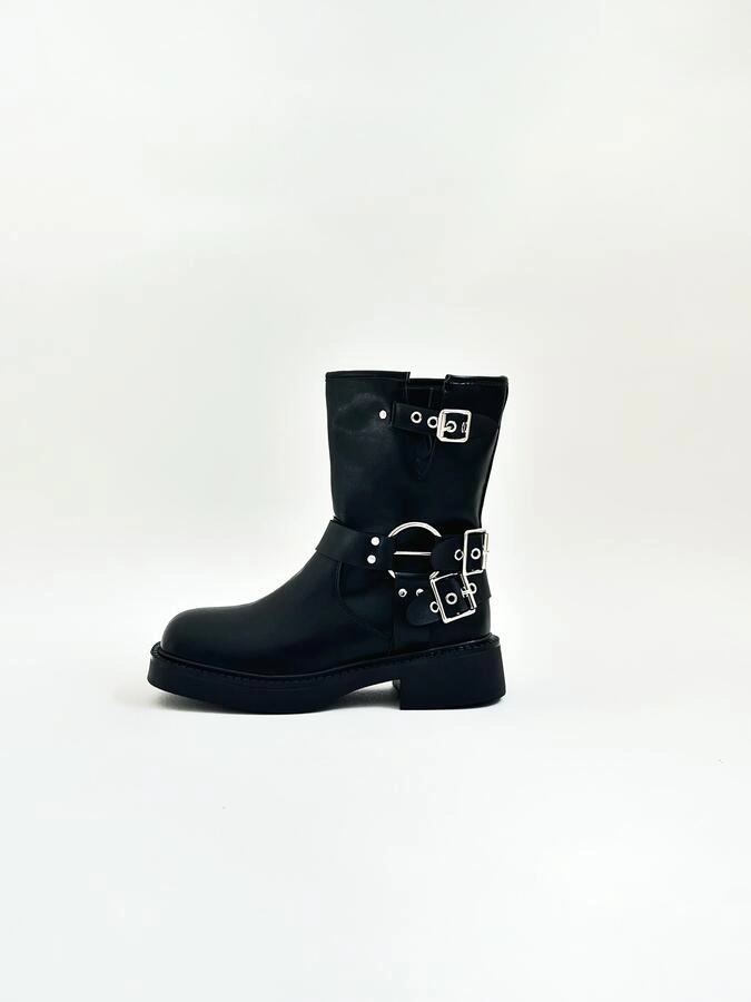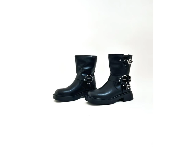 Botas de gamuza sintética con diseño texano y flecos laterales. De caña media, punta semi-fina y taco bajo.