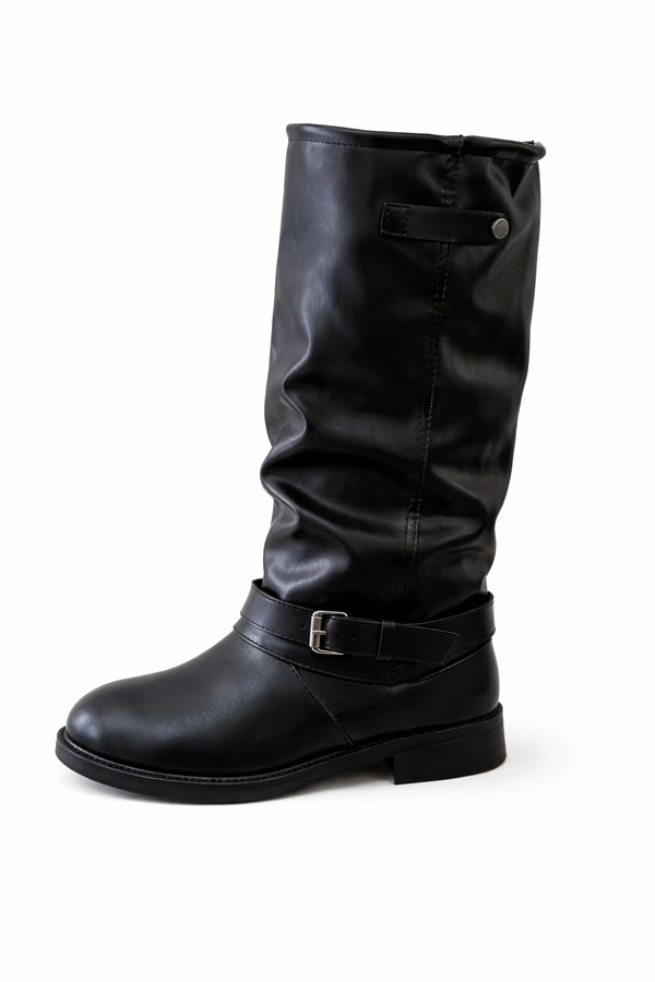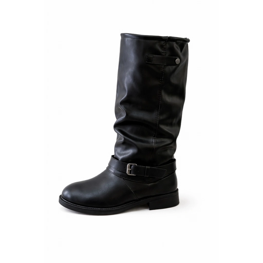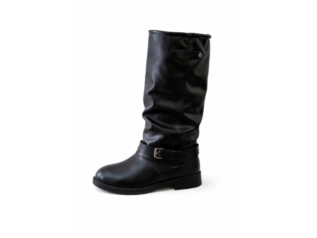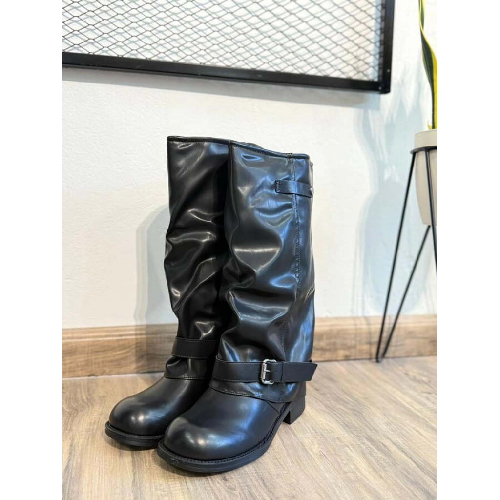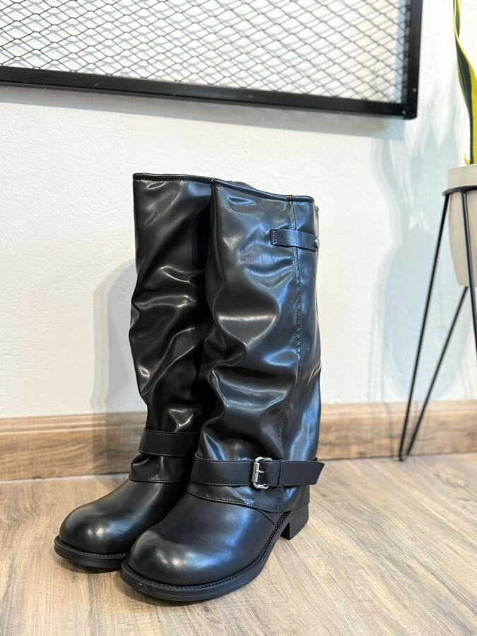 Botas altas estilo biker color negro, con caña fruncida, costura lateral visible, doble correa y hebilla metálica. Terminación tipo cuero, taco bajo y suela antideslizante para máximo confort. Talles: 36 al 40