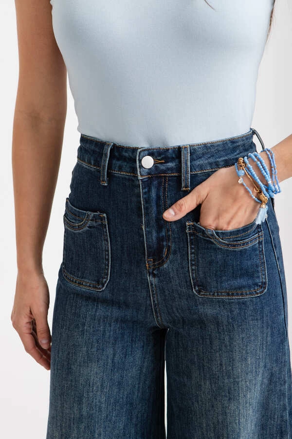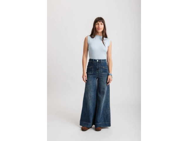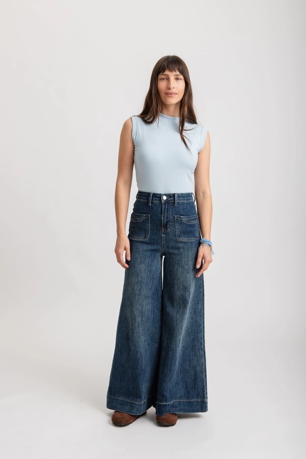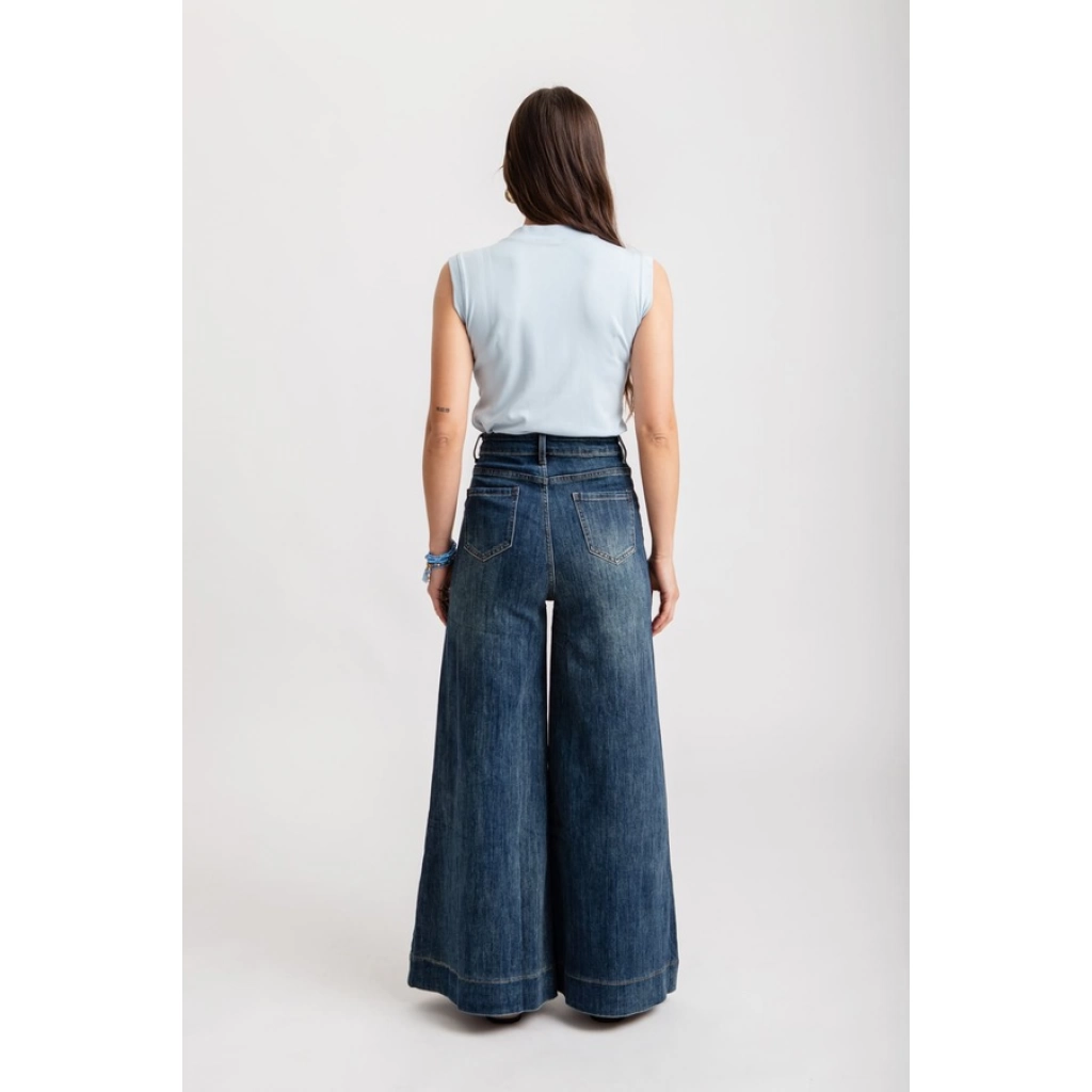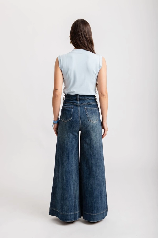 Tiro alto, con cintura anatómica. Diseño de pierna ancha tipo palazzo, terminación recta, sin desgastes.