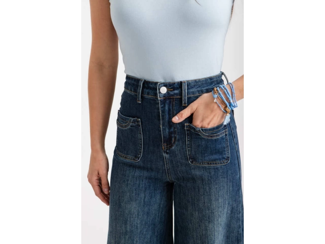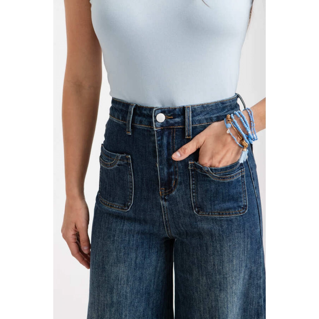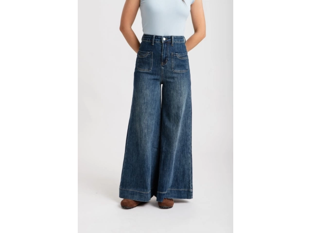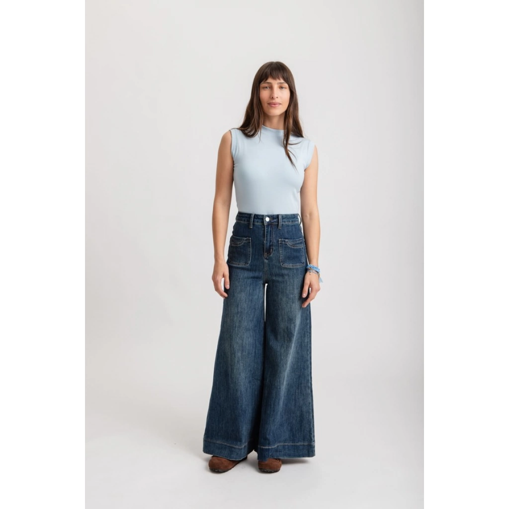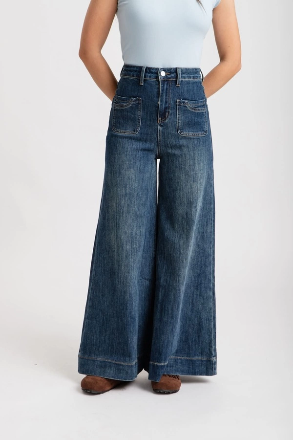 Tiro alto, con cintura anatómica. Diseño de pierna ancha tipo palazzo, terminación recta, sin desgastes.