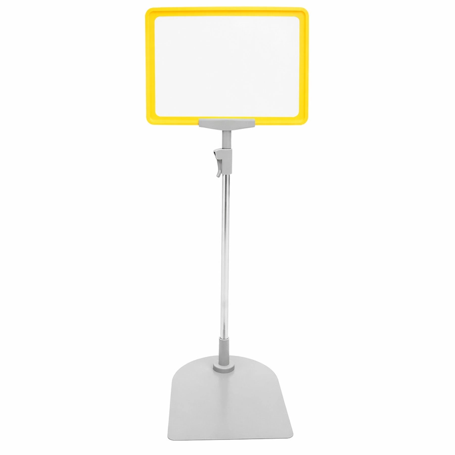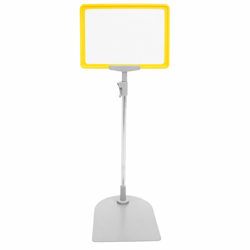 Soporte señalizador tamaño A5 con marco rígido. Altura ajustable de 93.5 a 134 cm, base estable de 21 cm, y cartel de 21.7 × 15.5 cm. Ideal para precios, anuncios y señalización en comercios. Fácil de montar, ligero y resistente. Perfecto para uso en mostradores, pasillos y eventos.