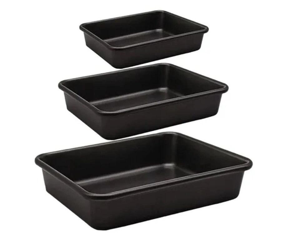 Set de bandejas rectangulares para horno en tres tamaños, resistentes y fáciles de limpiar. Ideales para cocinar en el hogar. Medidas: 32×22×5 cm / 37.5×25.5×5.5 cm / 42.5×28.5×5.5 cm.