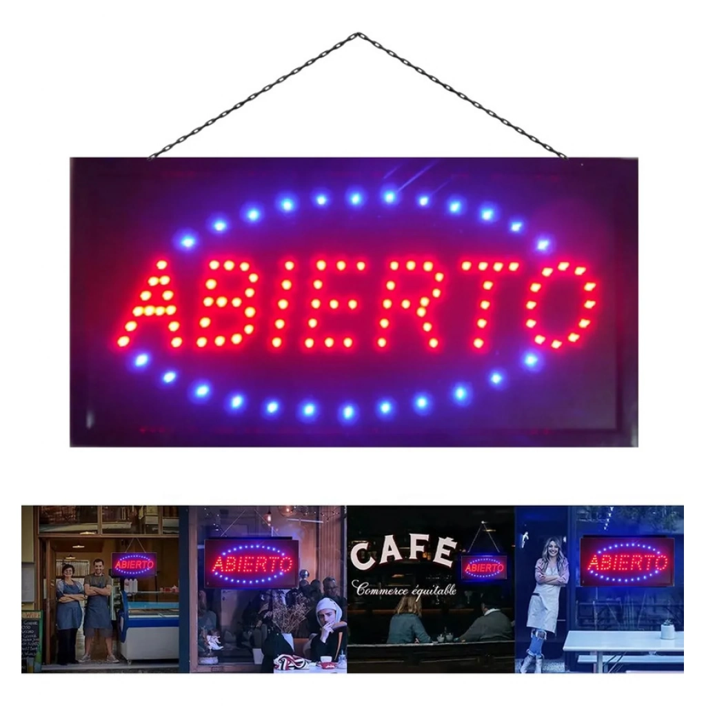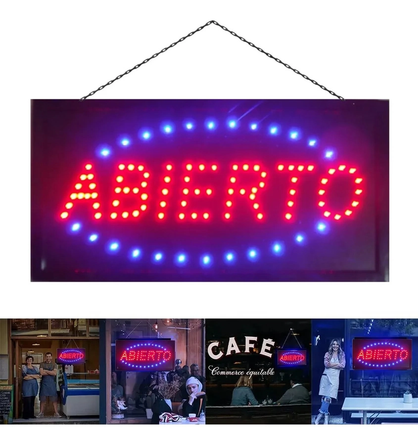 Cartel LED luminoso con cadena para colgar. Ideal para locales comerciales. Luz roja y azul.