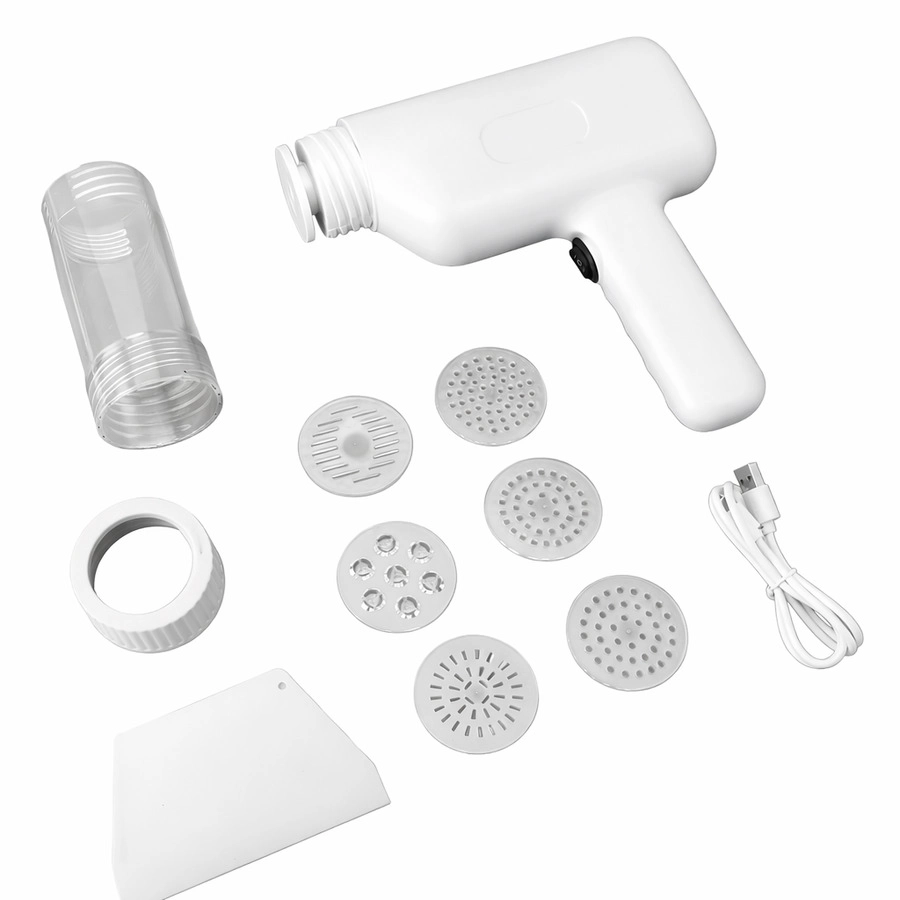 Maquina de fideos Incluye:1 cabezal, 6 moldes, 1 tabla de cortar,1 Cable USB,1 Cilindro,1 Unidad principal (batería incorporada) CANTIDAD POR CAJA: 24 UNIDADES