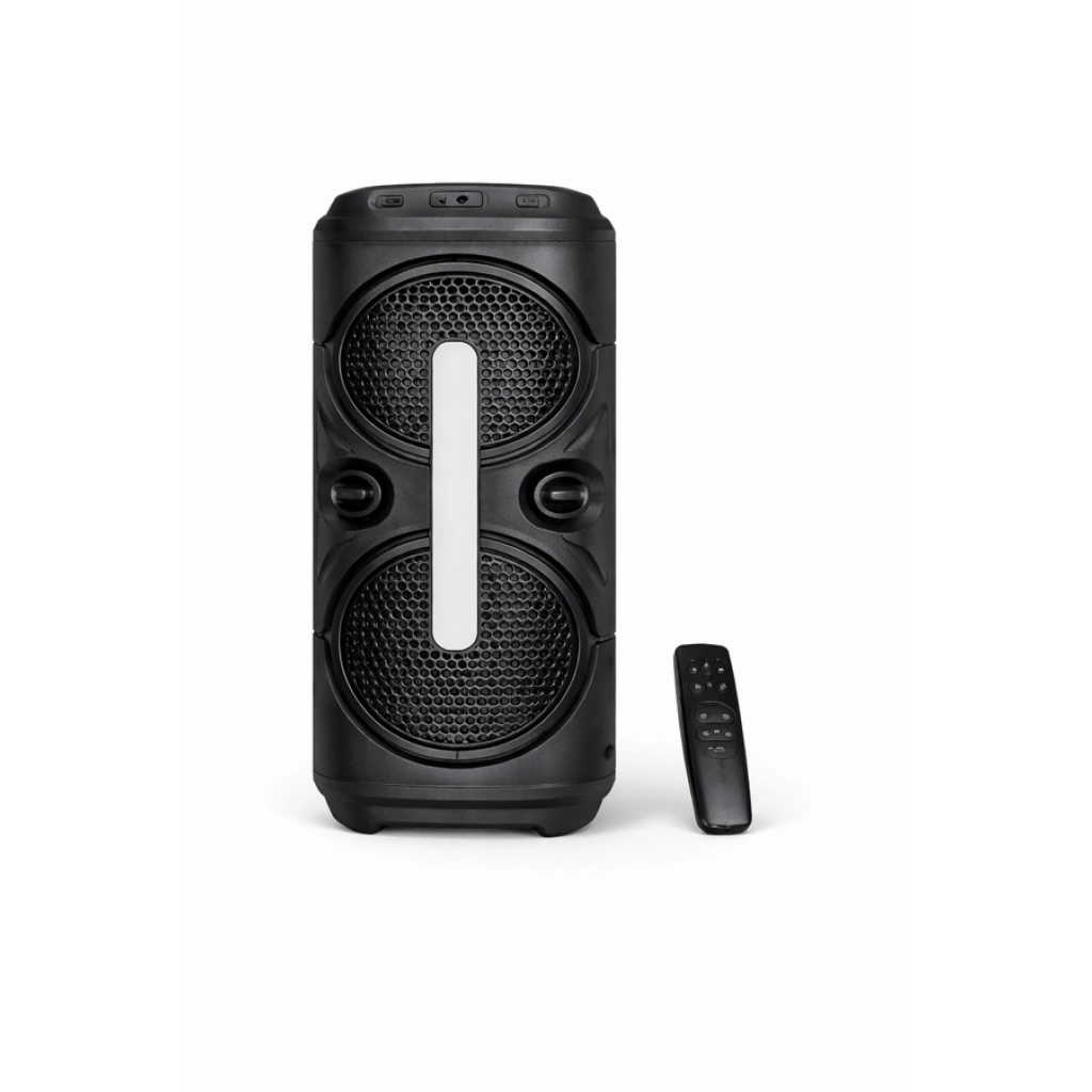 Parlante Doble 6.5'' Tamaño: 50 × 19 cm Incluye: 1 micrófono inalámbrico Características Material: Plástico resistente CANTIDAD POR CAJA: 8 UNIDADES Potencia: 5W × 2 Altavoces: 2 woofers de 6.5 pulgadas Batería: 18650 / 3.7V / 1500 mAh Funciones: Bluetooth, USB, tarjeta TF, FM Accesorios Micrófono inalámbrico Cable de carga Type-C Compacto, portátil y con gran sonido para reuniones, eventos o uso en casa. LA CAJA CONTIENE: 8 UNIDADES