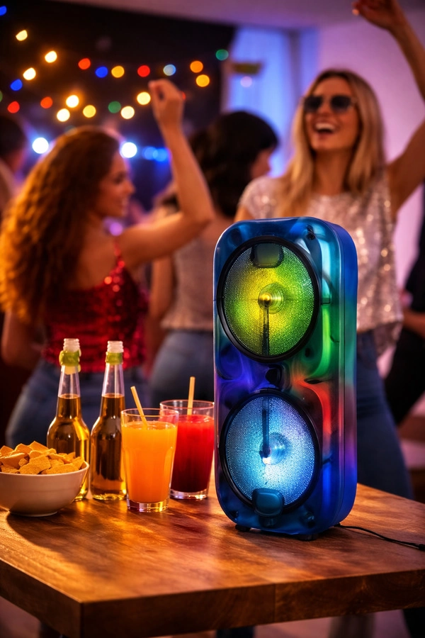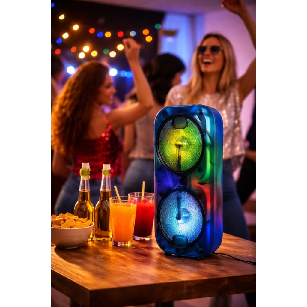 PARLANTE BOCINA DOBLE 3" Bluetooth: Versión 5.0 / BT SPEAKER USB, TF, FM, TWS, LINE IN, Luces LED Altavoz: 4''×2, 2×5W Batería: 1200mAh Voltaje de funcionamiento: DC 3.7?4.2V Carga: DC 5V, 1A Carcasa: Material PP Medidas: 13x11x27cm CANTIDAD POR CAJA: 40 UNIDADES