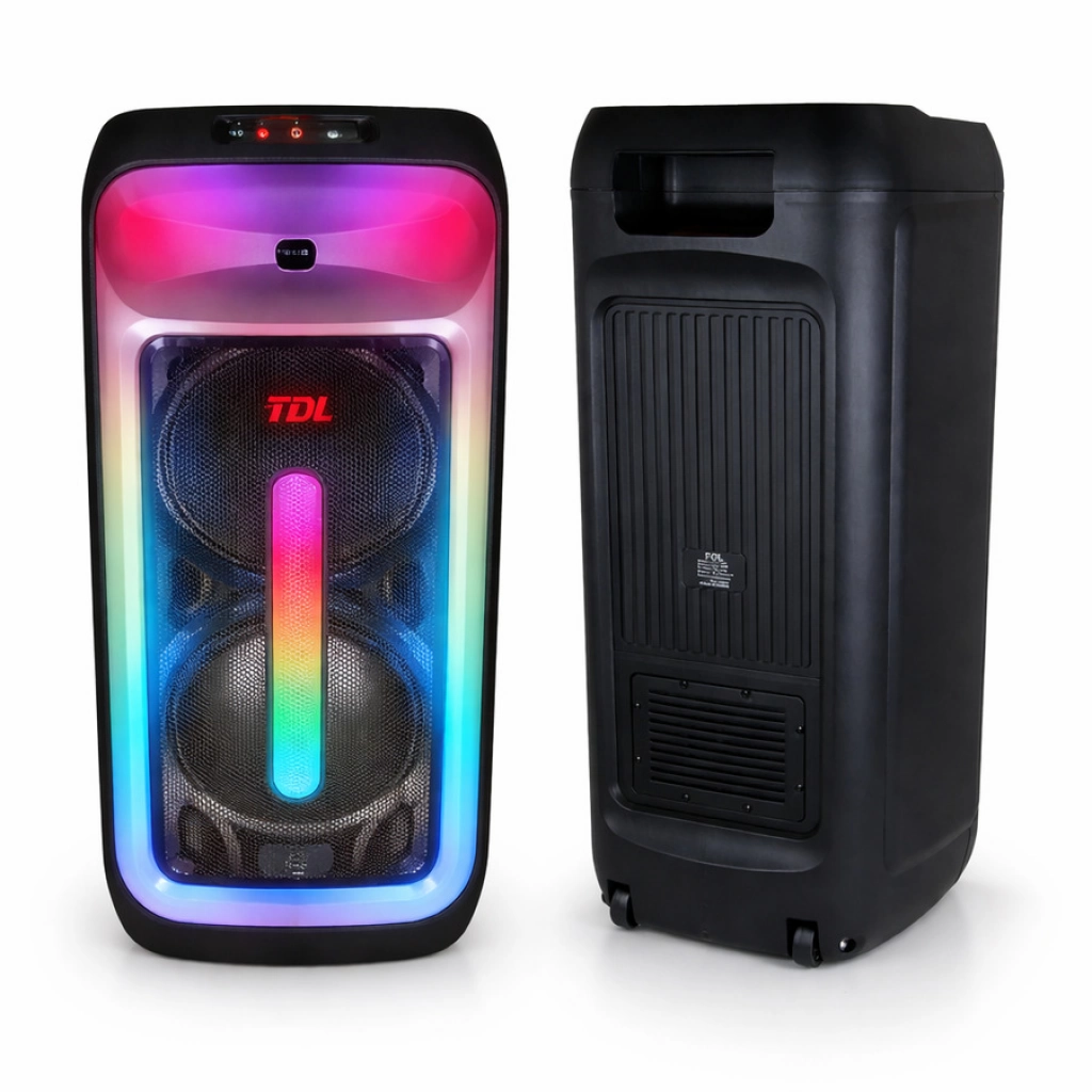 PARLANTE BOCINA DOBLE 10"Potencia: 5 bandas EQ, 60W Configuración: 2 altavoces de 20 cm, imán 90, 2 subwoofers + luz de llama Batería: 11,1V / 2400mAh Accesorios: micrófono inalámbrico simple + control remoto + adaptador 13,5V 1,5A Funciones: USB, tarjeta TF, Bluetooth, pantalla, FM, TWS Medida:330x300x790mm CANTIDAD POR CAJA: 1 UNIDADES
