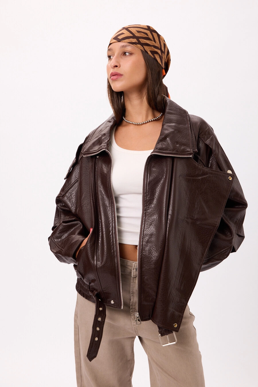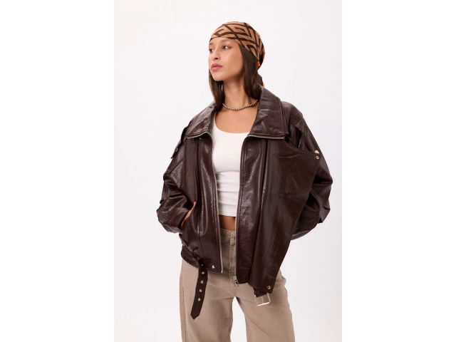 Campera biker de eco cuero con cierres y detalles metálicos Colores: negro y marrón. Talles: M/L.