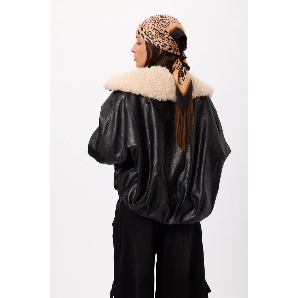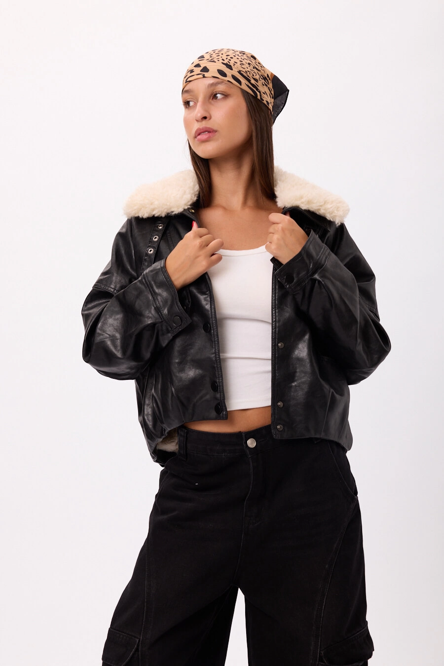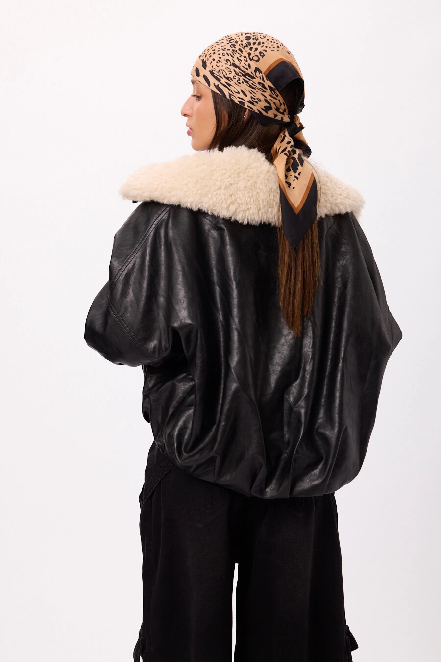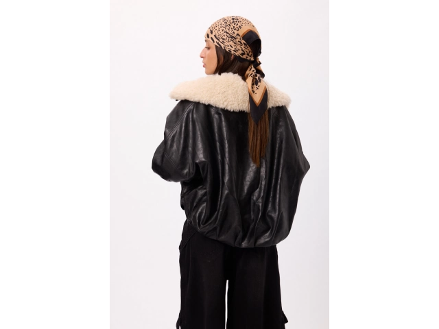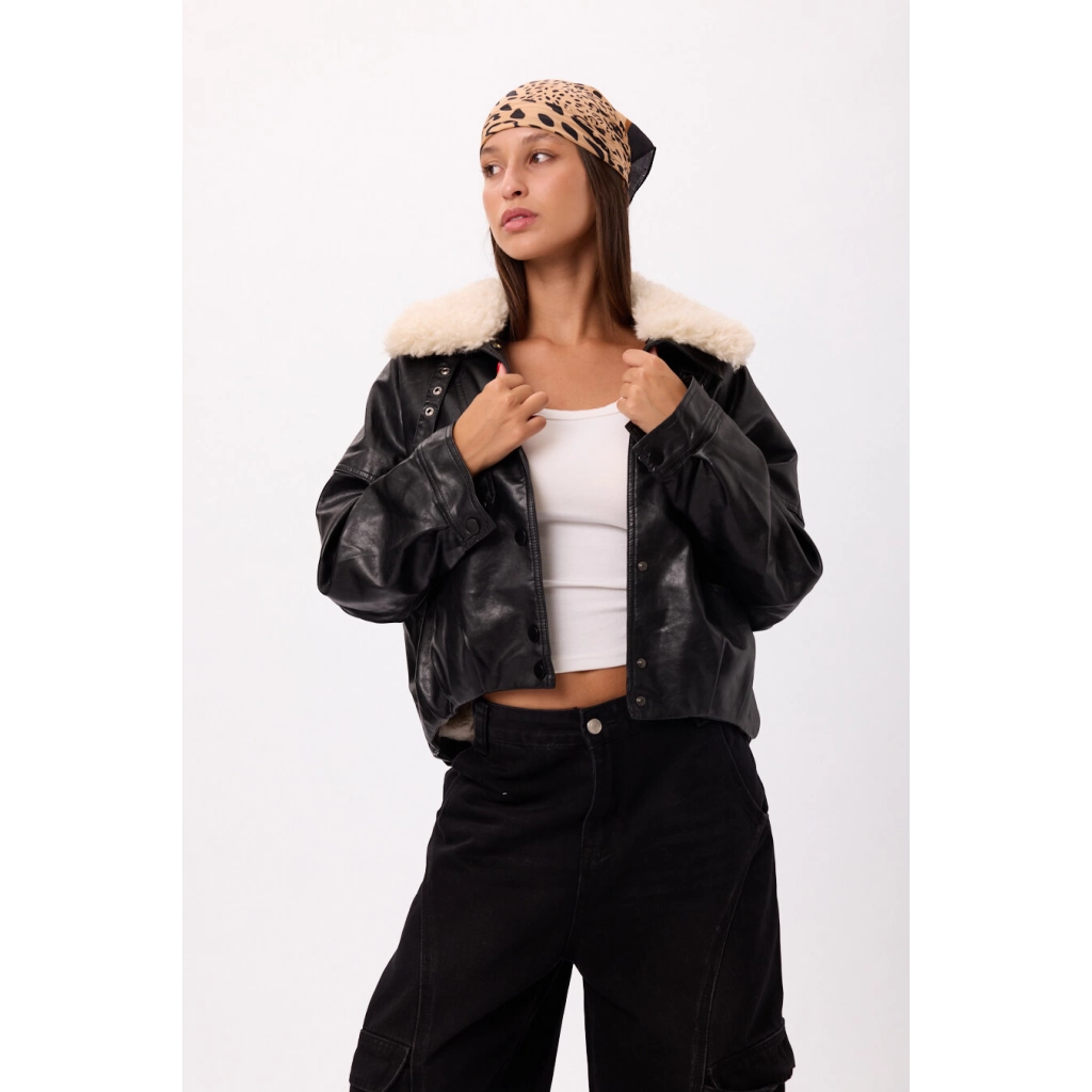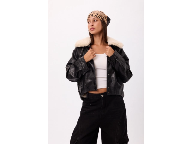 Campera bomber de eco cuero con cuello de corderito, Colores: marrón y negro. Talles: M/L/XL.
