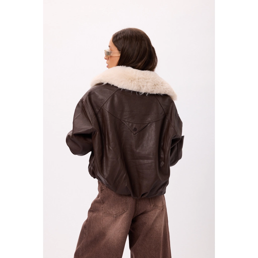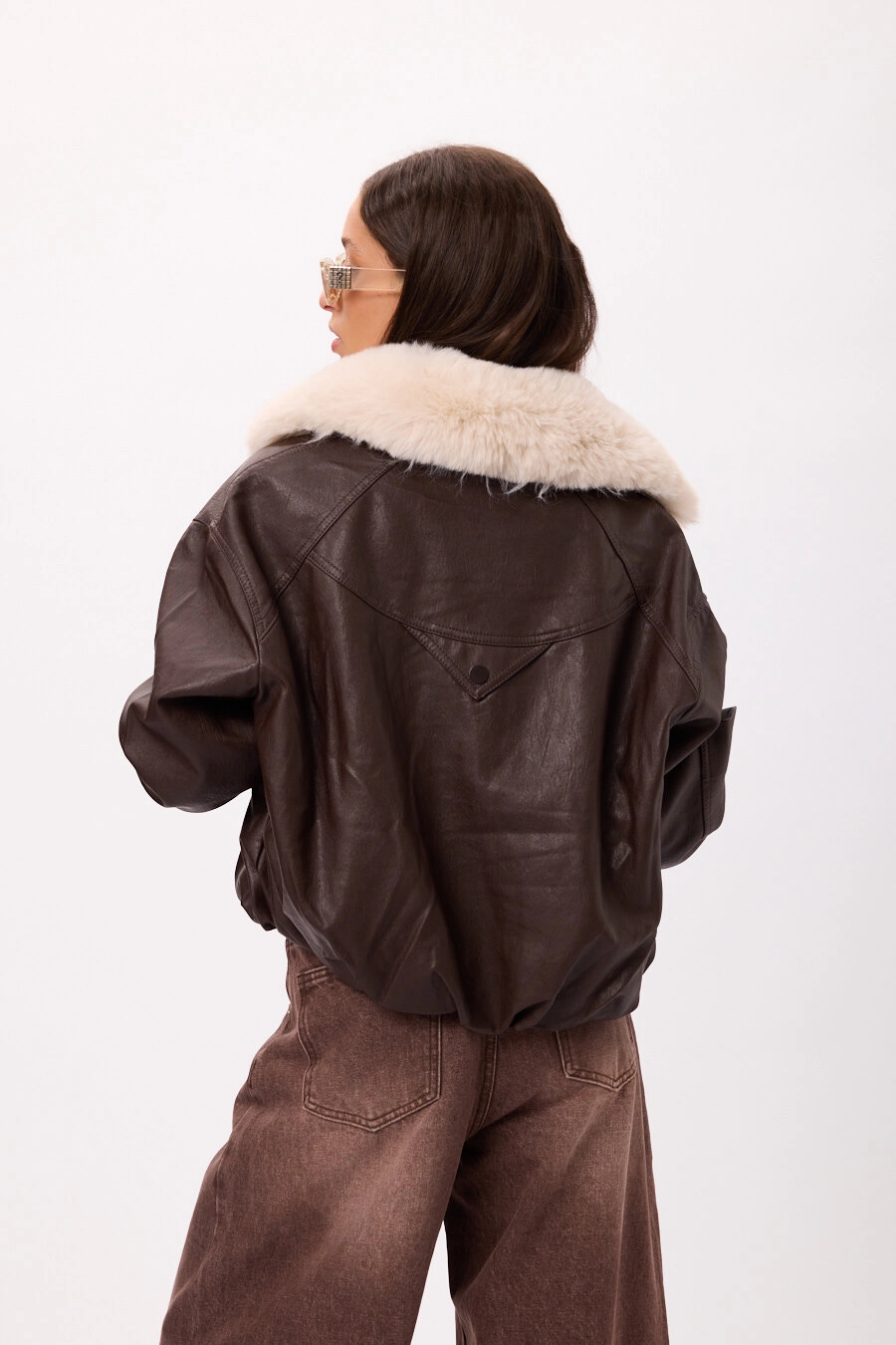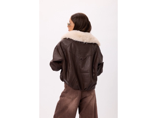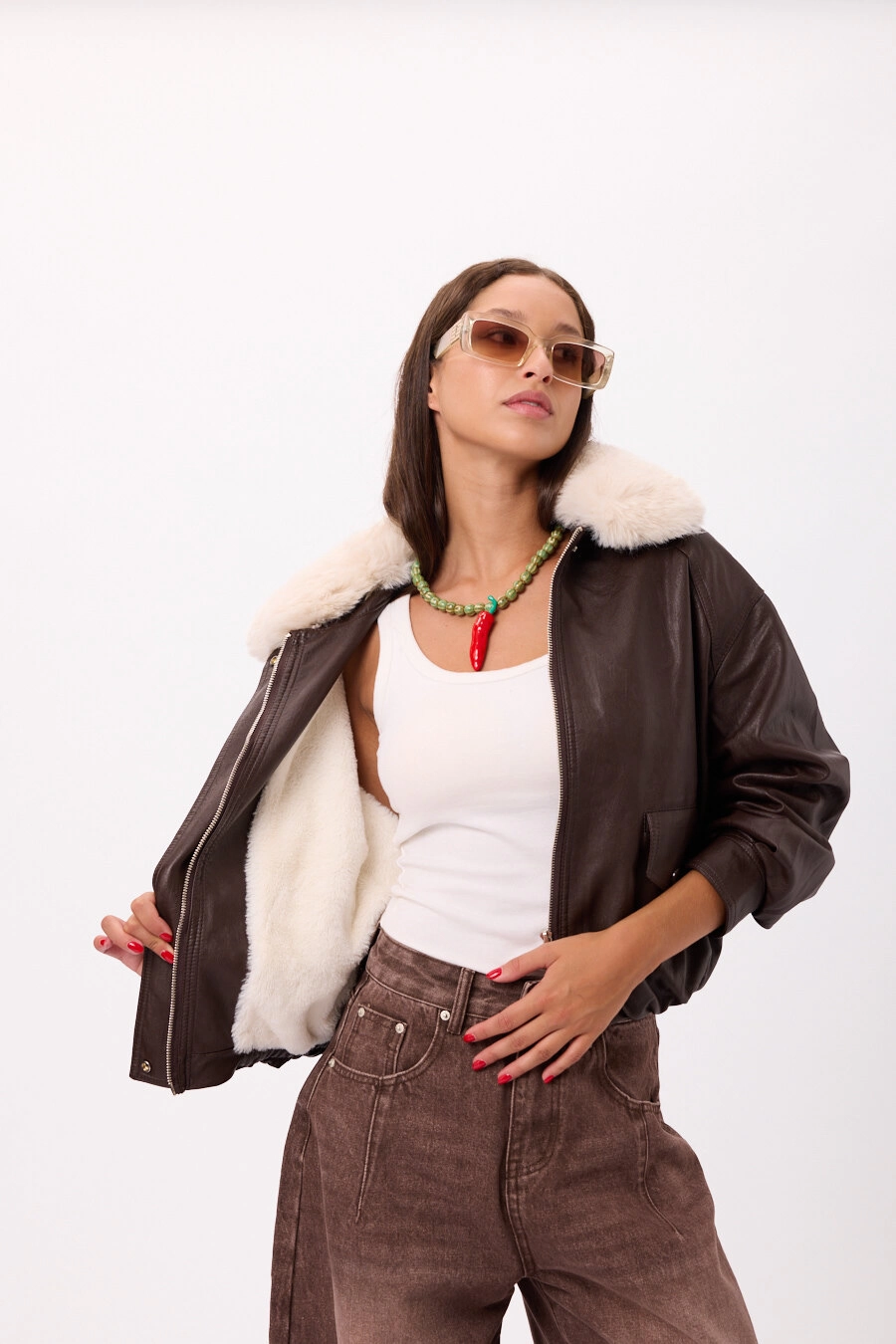Campera bomber de eco cuero con cuello de corderito, Colores: marrón y negro. Talles: M/L/XL.