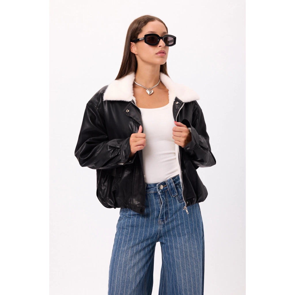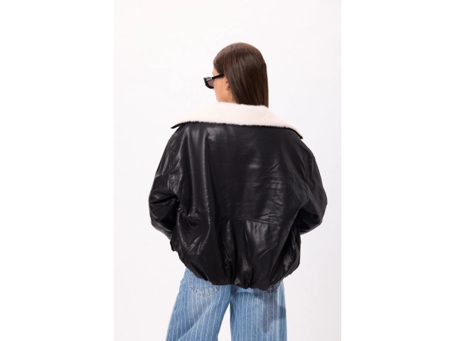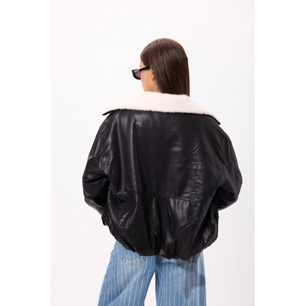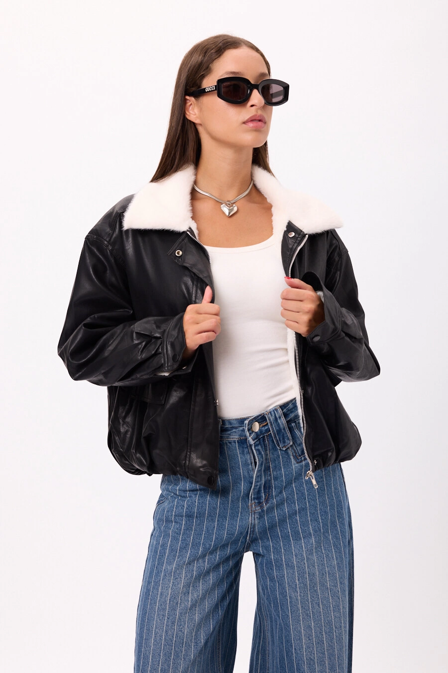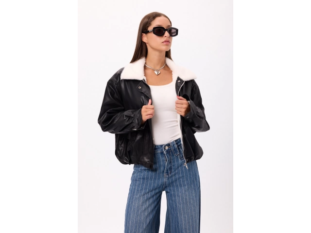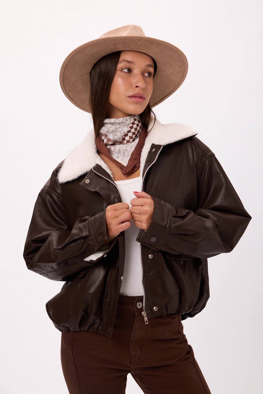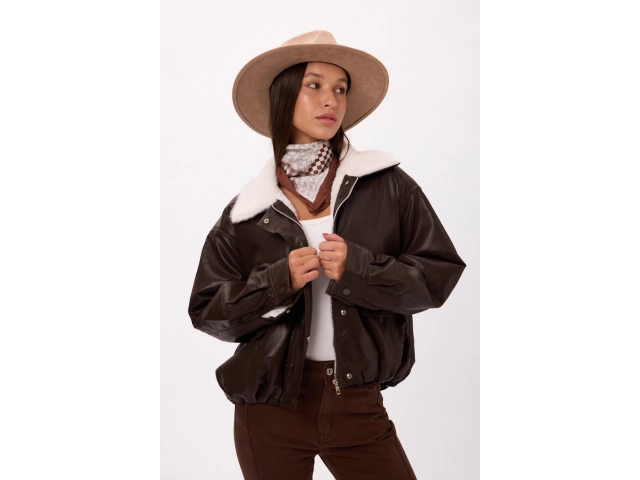 Campera bomber de eco cuero con cuello y forro interno de corderito Colores: negro y marrón.