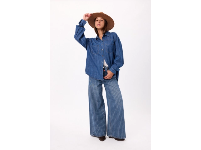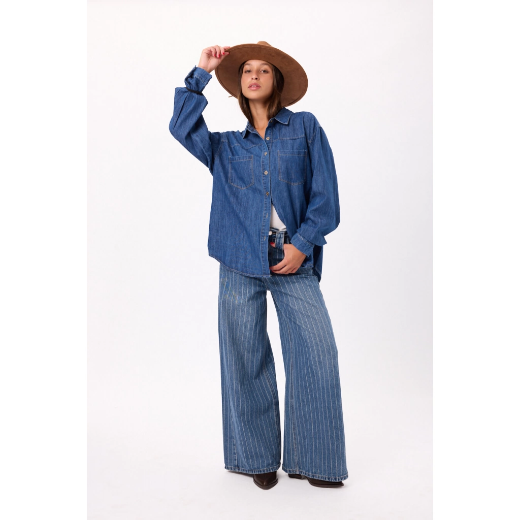 Camisa de jean oversize, manga larga, botones frontales, cuello camisero, 2 bolsillos delanteros. Talle único.