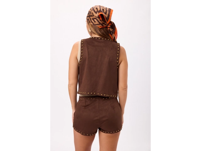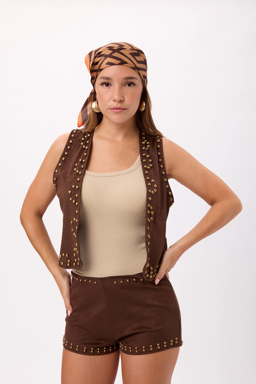 Short efecto cuero con tachas Talles: S / M / L Material gamuza con tachas doradas en cintura y ruedo Corte cómodo y tiro medio
