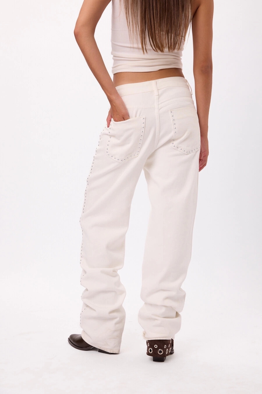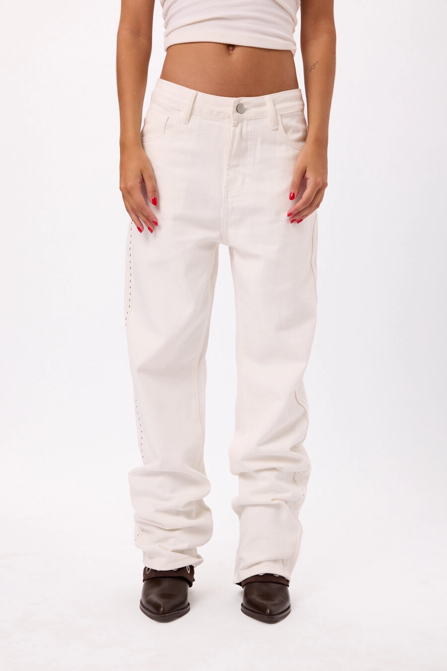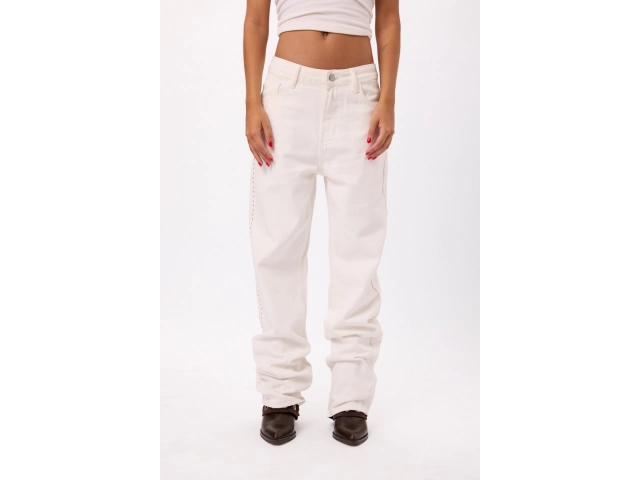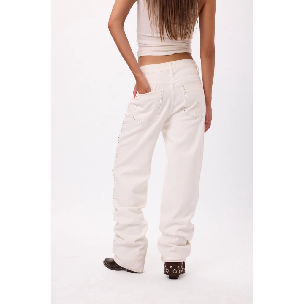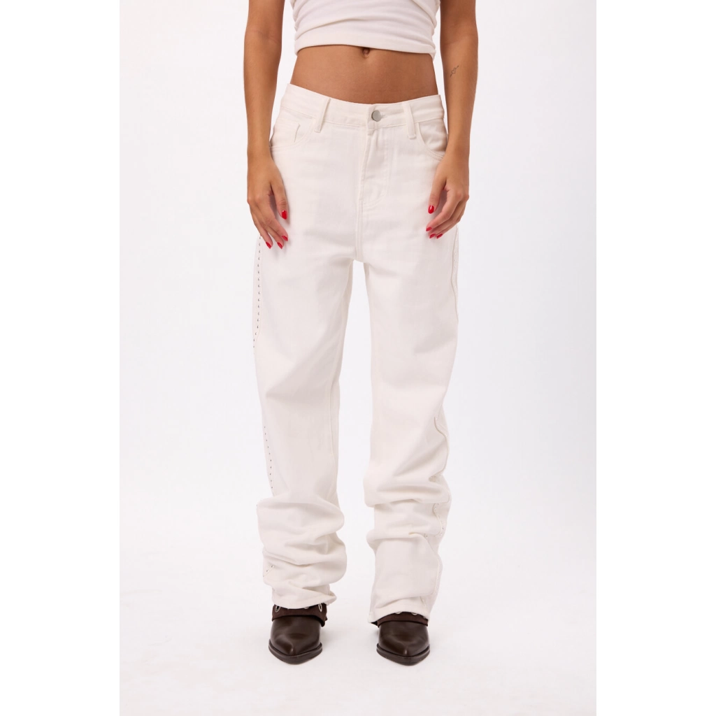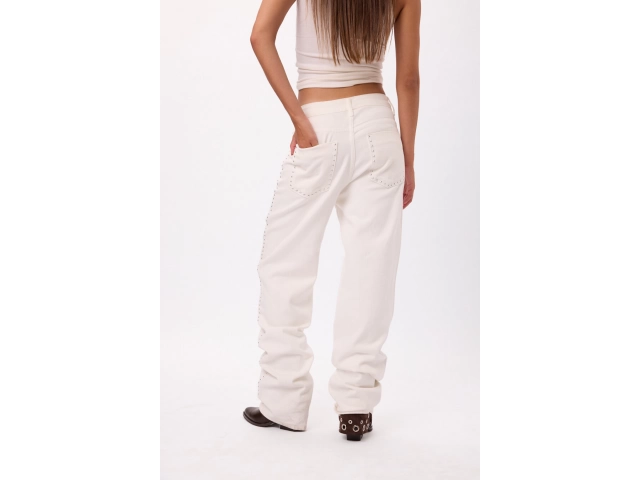 Pantalón blanco tiro alto con detalles de tachas laterales, Talles disponibles: S/M/L.
