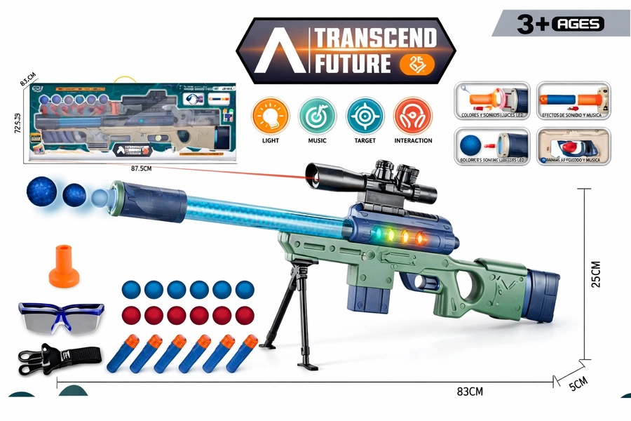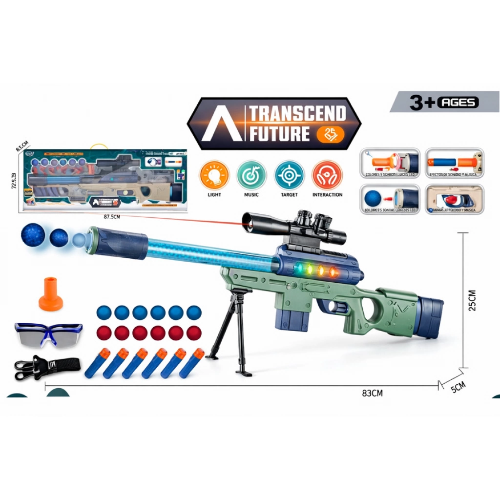 Rifle de juguete de gran tamaño con efectos de luz y sonido, mira incorporada y proyectiles suaves. Incluye trípode y accesorios. Dimensiones del arma: 83×25 cm. LA CAJA CONTIENE 16 UNIDADES
